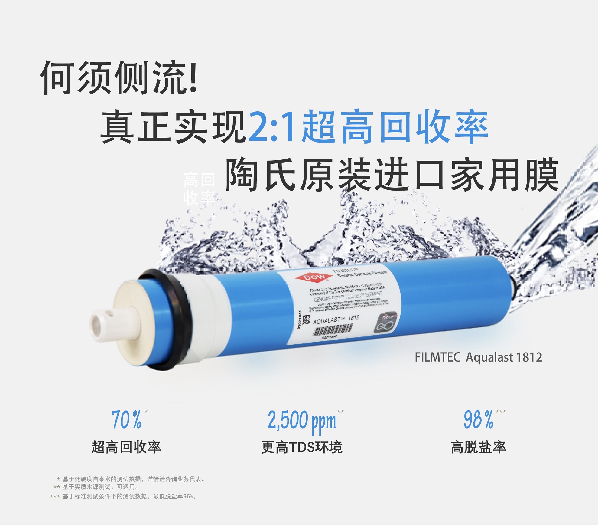 陶氏AQUALAST反滲透膜元件具有優(yōu)異的防垢性能和高回收率,且對凈水器生產(chǎn)商來(lái)說(shuō),無(wú)需定制壓力容器或購置成本高昂的封裝產(chǎn)品,是家用凈水器的理想之選。即使在溶解性固體總含量(TDS)較高的水環(huán)境中,陶氏AQUALAST 1812反滲透膜元件的性能表現也十分出色,不僅使用壽命延長(cháng)達二倍,還具有業(yè)內領(lǐng)先水平的流速,優(yōu)于市場(chǎng)上的其它家用反滲透膜產(chǎn)品。
